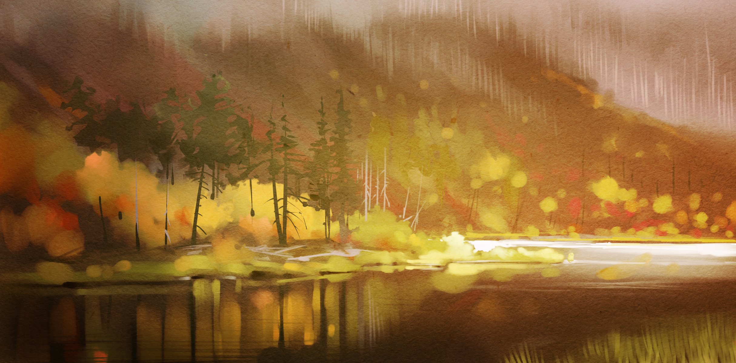 Alberi di Natale sulla riva del Lago sullo sfondo delle montagne