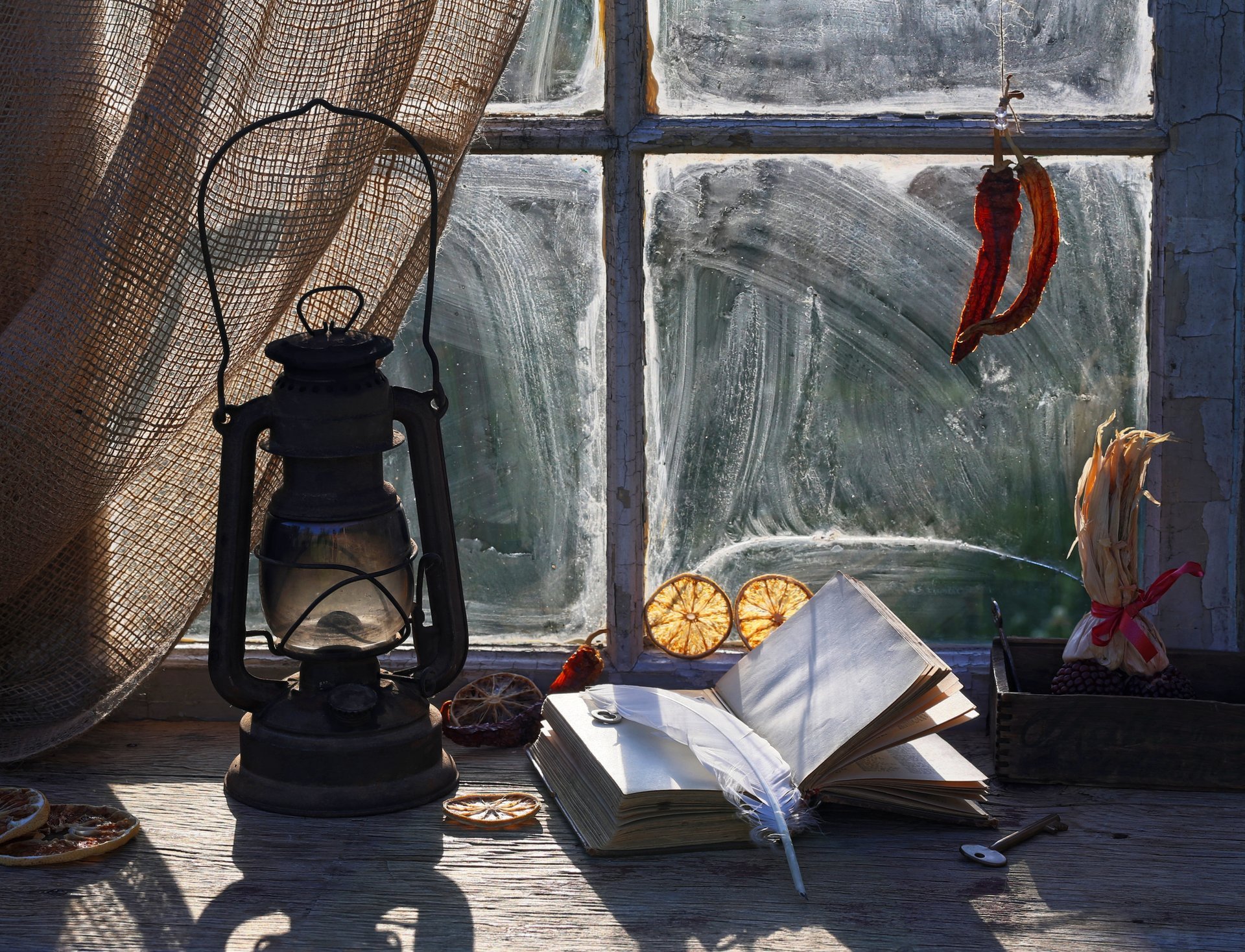 Libro con penna e lampada a cherosene sul davanzale della finestra