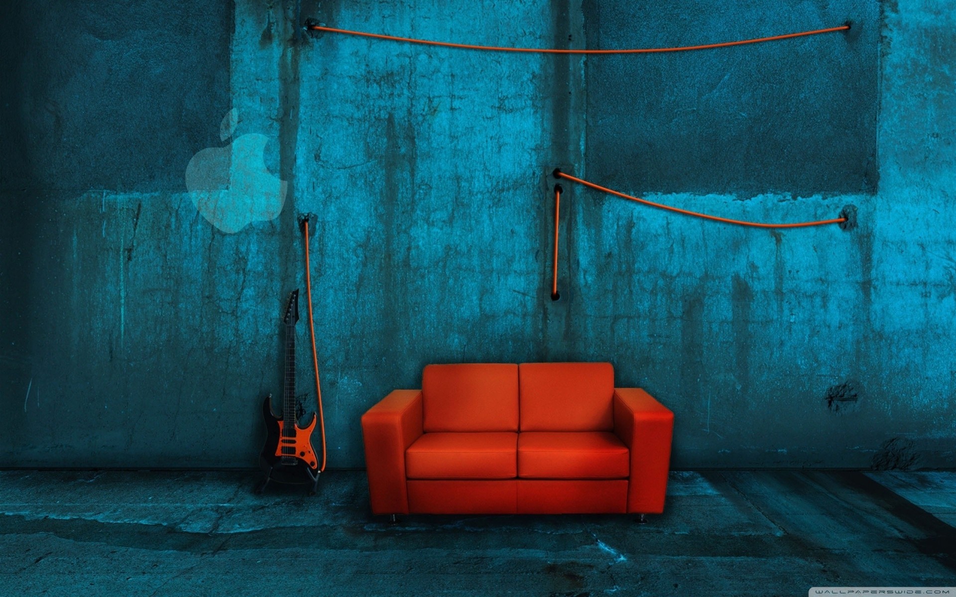 Su sfondo blu divano rosso, chitarra e mela