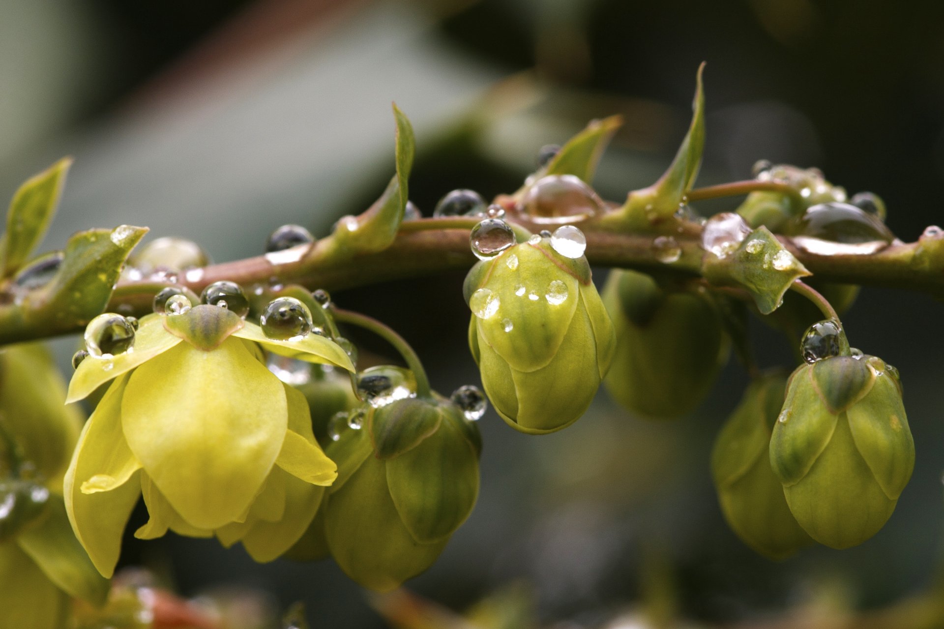 I fiori sbocciano su un ramo nutrendosi di gocce