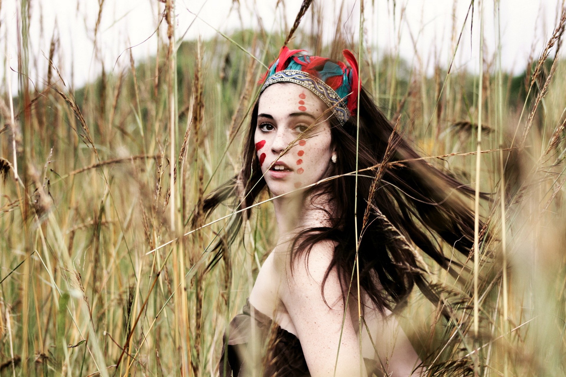 Ragazza nel campo tra erba e spighette nello stile dell'Indiano