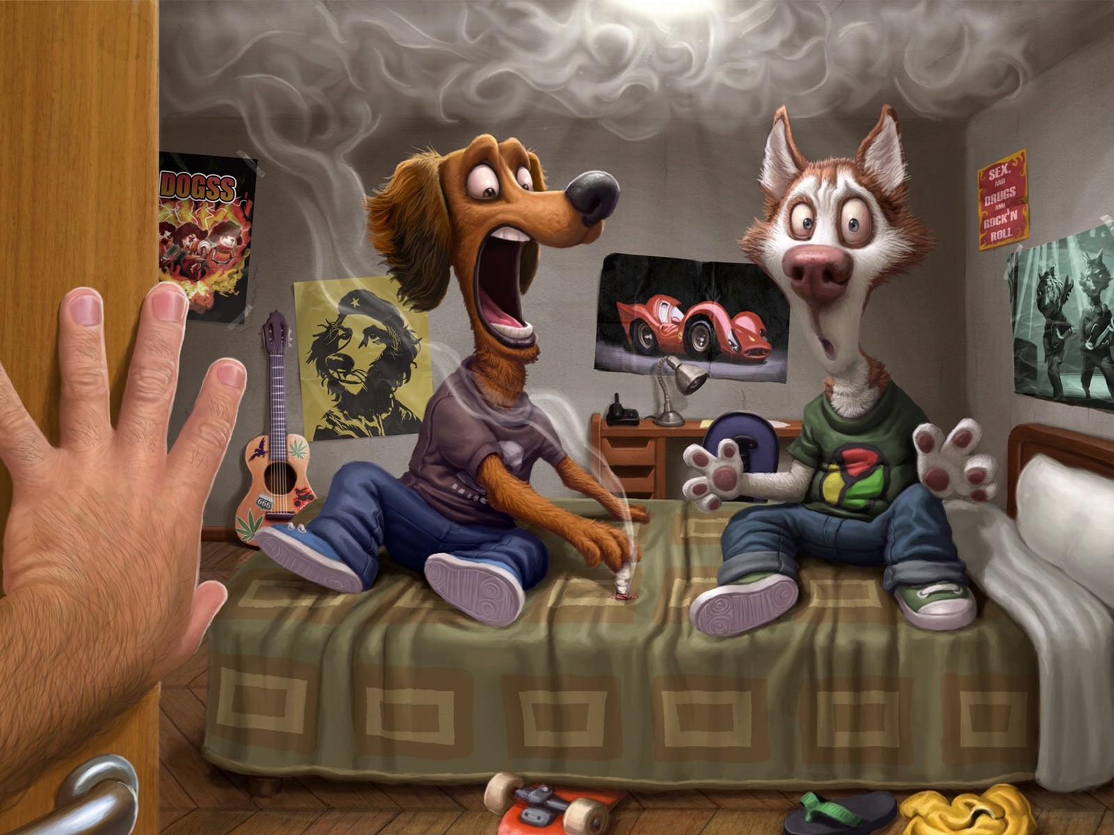 Una cornice di un cartone animato su un gatto e un cane