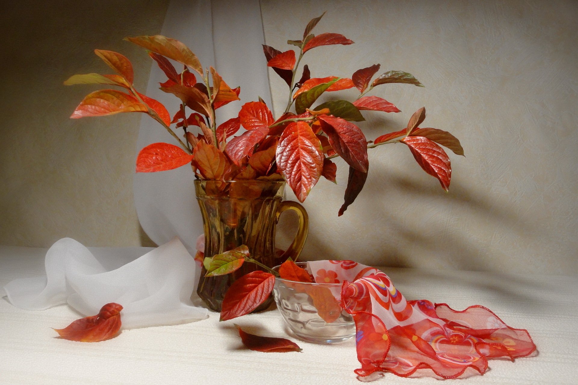 Vaso di Natura morta con foglie. D'autunno