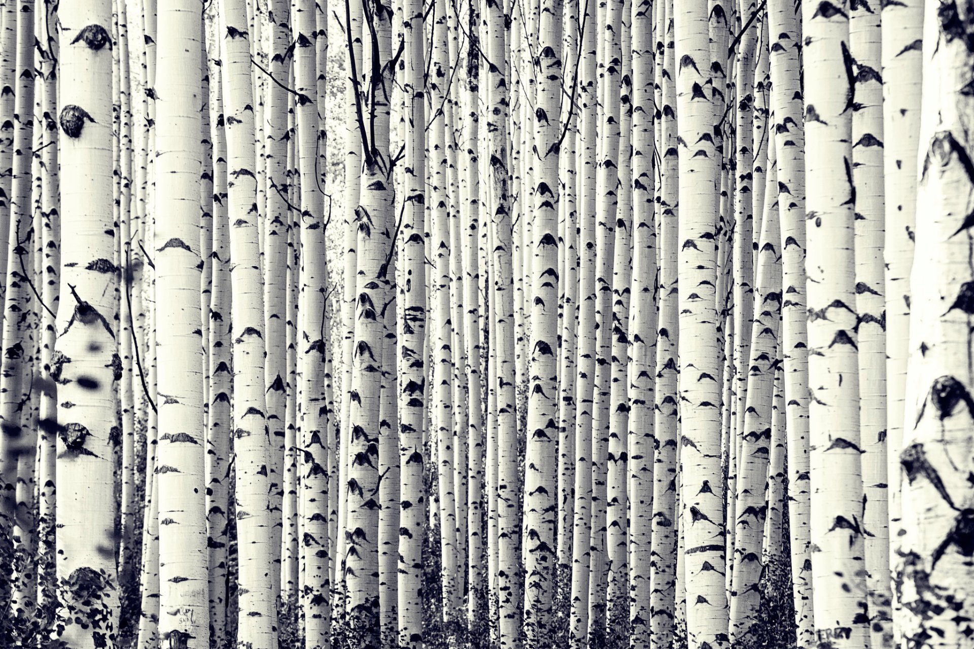 Muso di lupo con occhi arancioni e tronchi di betulla