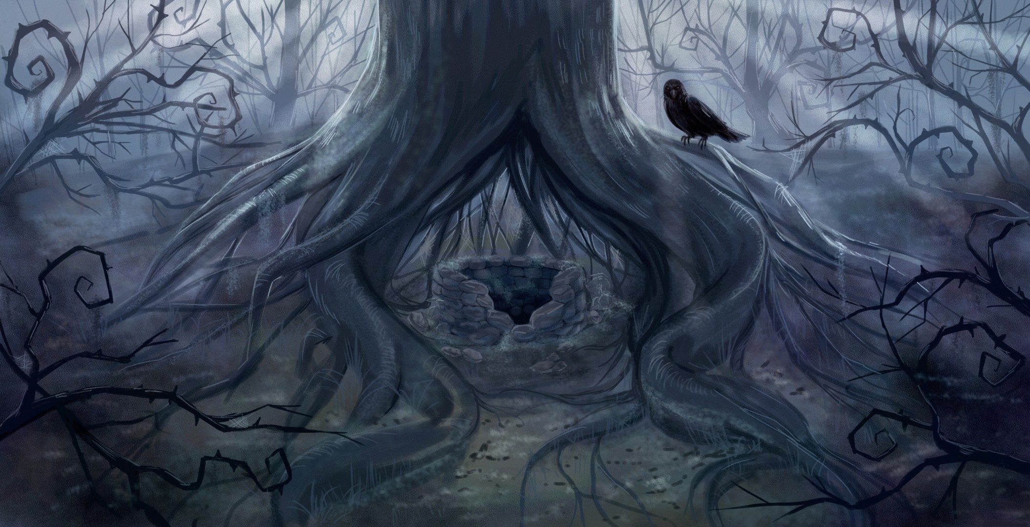 Un albero gotico in grigio scuro con un corvo e un coniglio Bene-aspetta un attimo