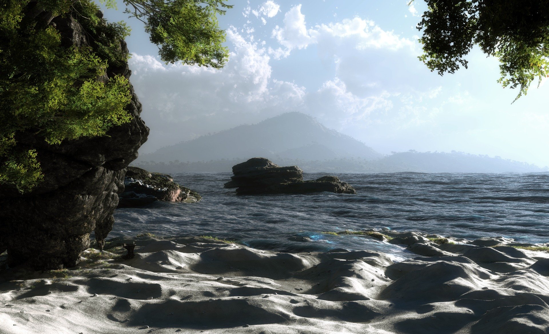 Tramonto invernale sullo sfondo di alberi, fiume con neve