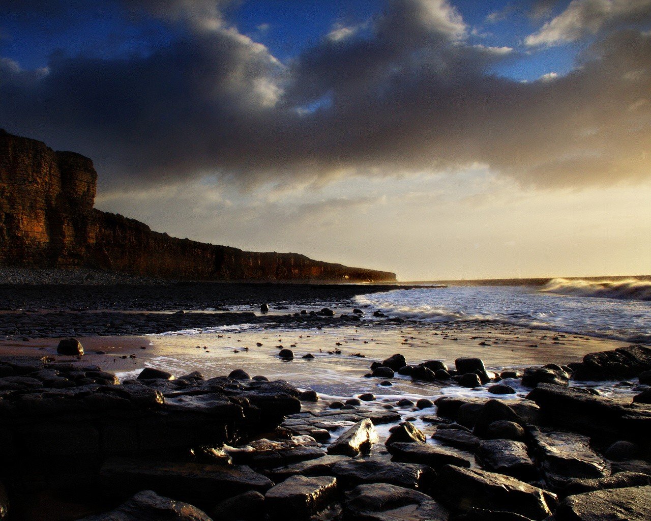 Tramonto invernale sulla spiaggia tra bellissime nuvole costa deserta