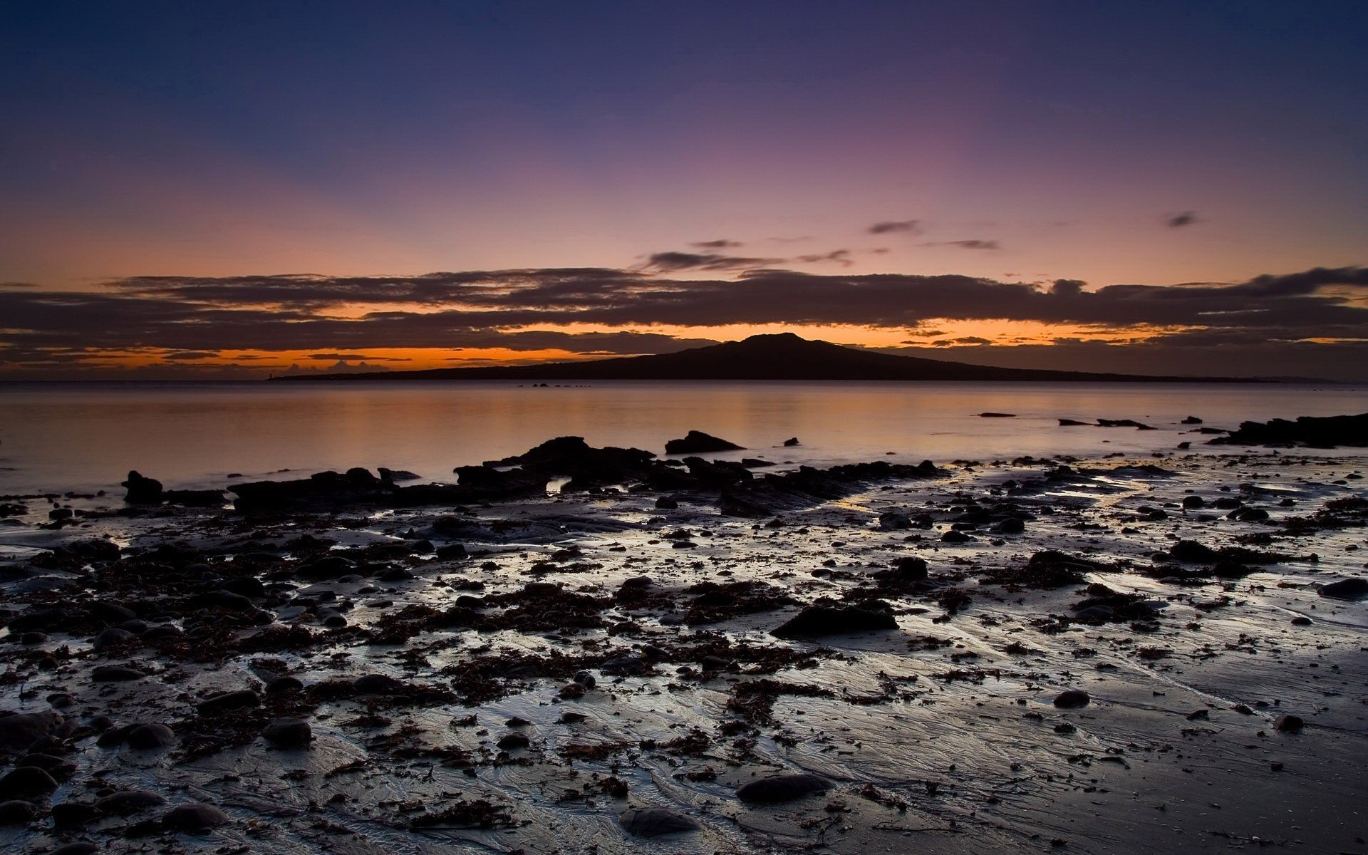 Costa rocciosa notturna con le luci della città all'orizzonte