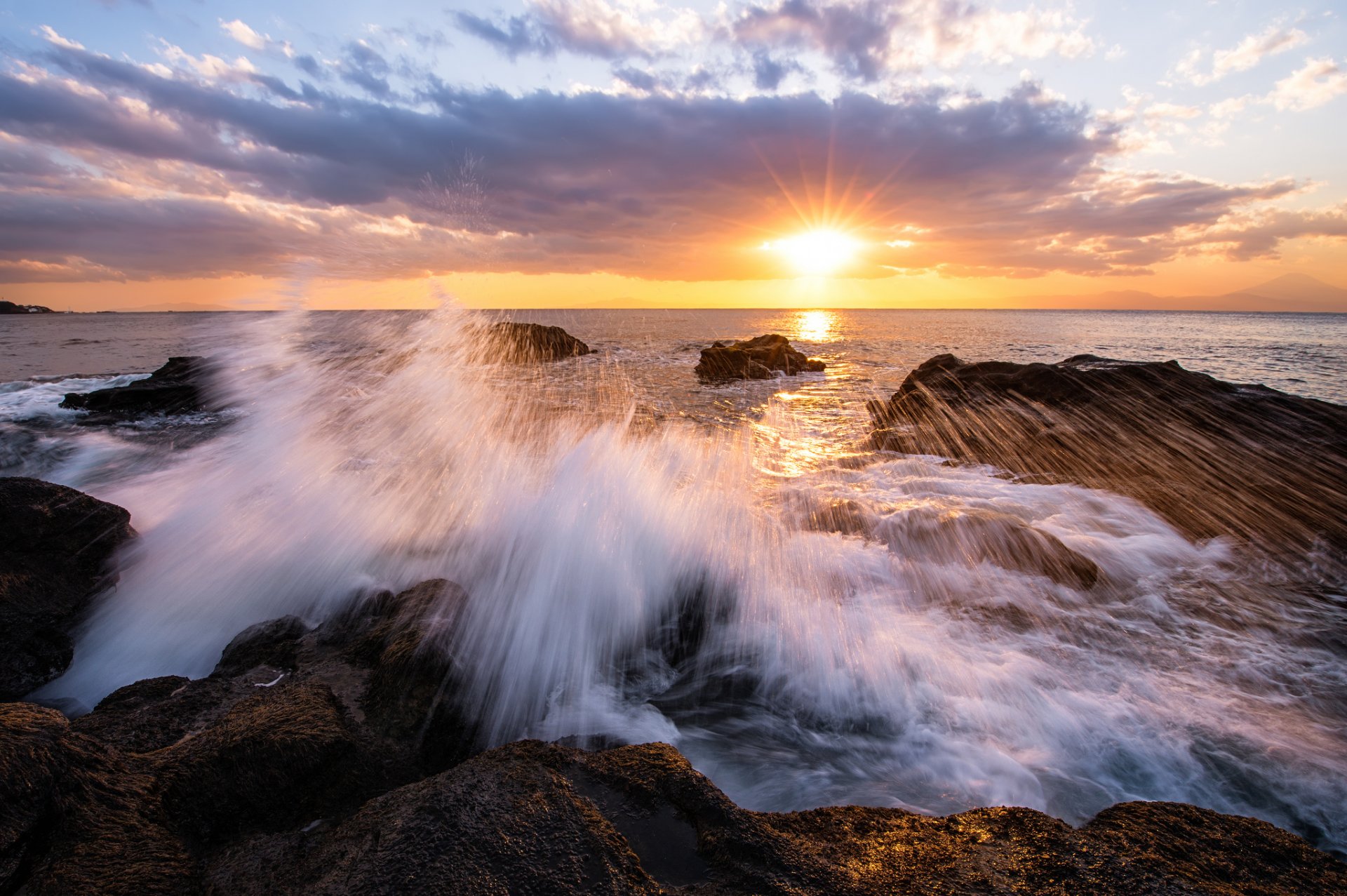 Isola tropicale con costa sabbiosa, grandi rocce e palme