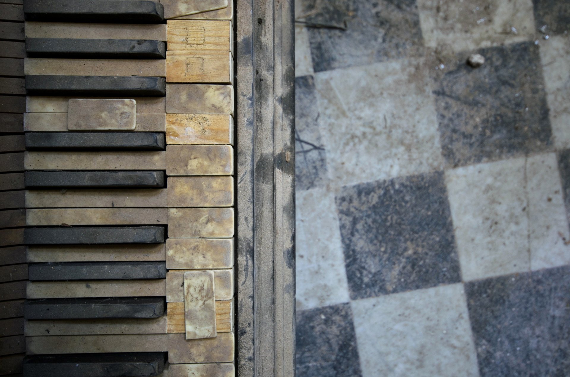 Vecchi tasti di pianoforte rotti su uno sfondo di piastrelle