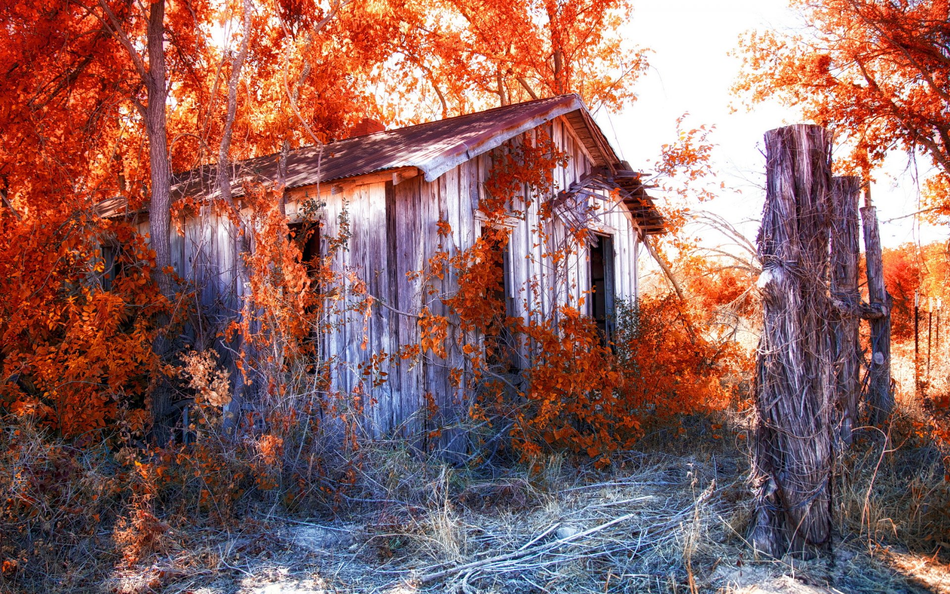 Casa nella foresta con foglie rosse