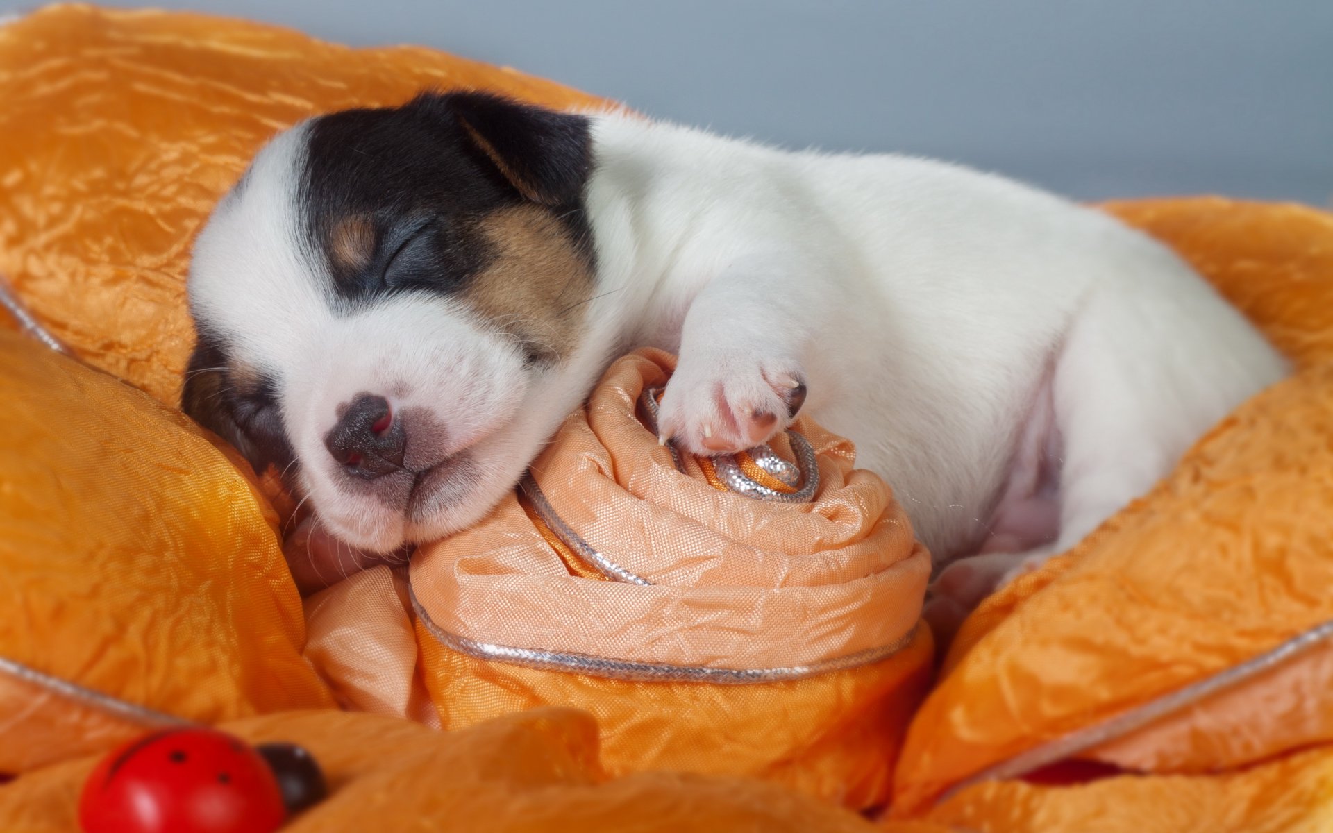 Cucciolo bianco che dorme su un plaid lavorato a maglia