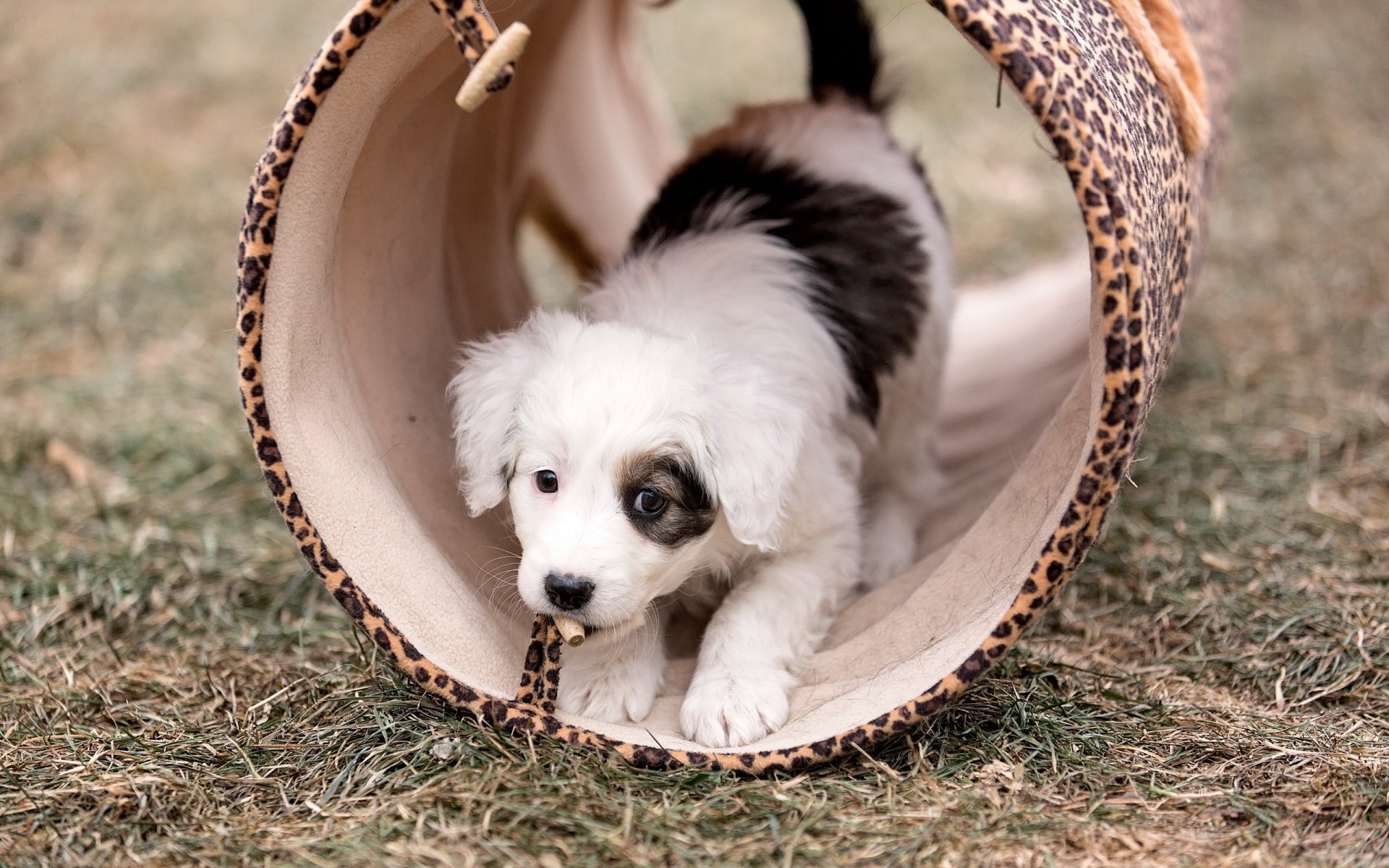 Cucciolo bianco in berretto grigio lavorato a maglia sull'erba