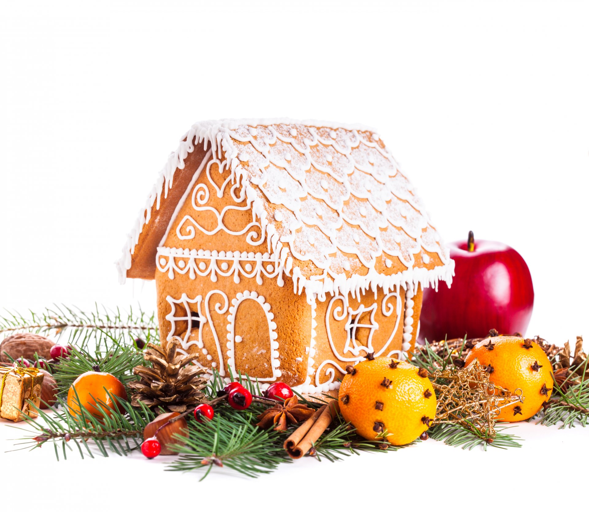 Tre giocattoli di Natale rossi e un omino di pan di zenzero