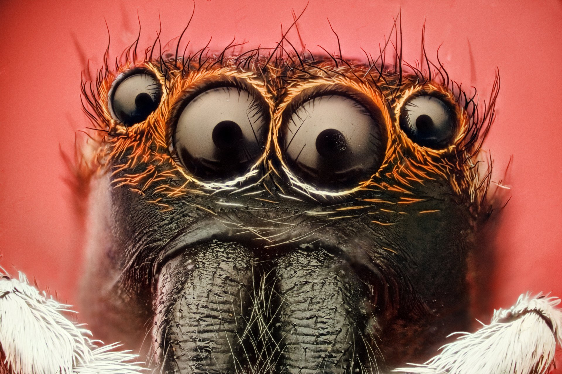 Ragno spaventoso con quattro occhi su sfondo rosso