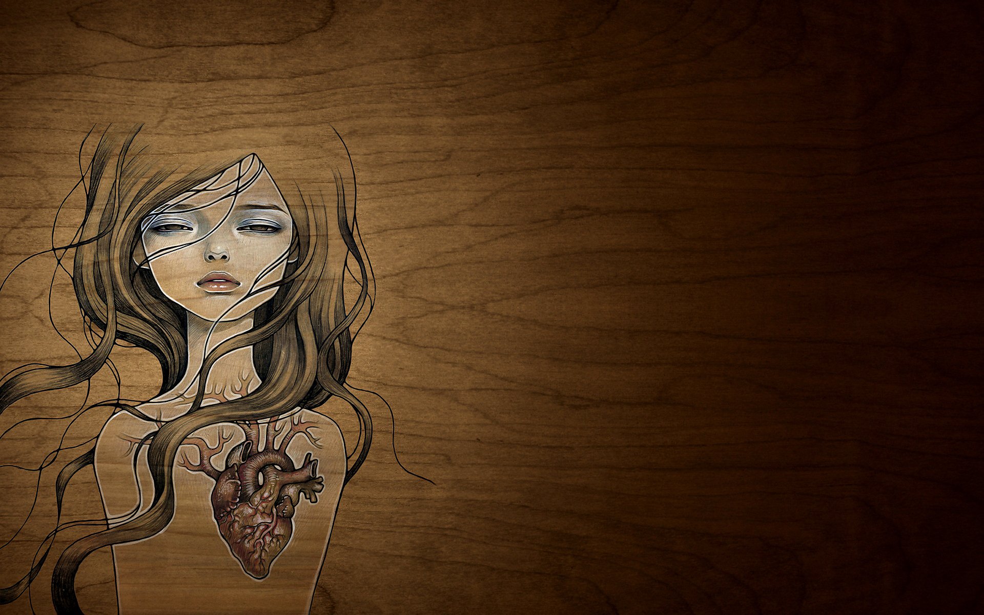 Disegno di una ragazza con un cuore su uno sfondo di struttura in legno