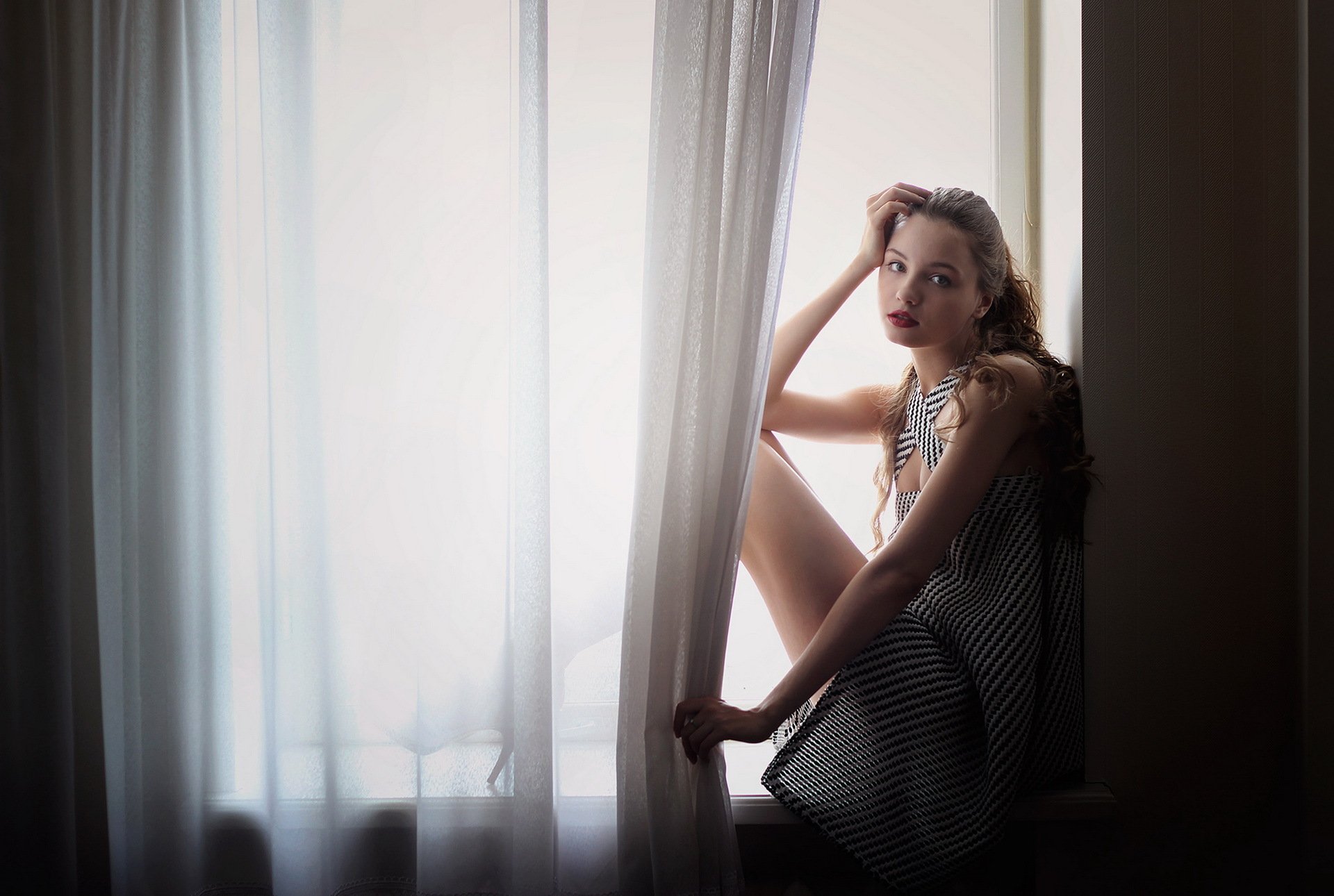 La ragazza si siede sul davanzale della finestra e guarda fuori dalla finestra
