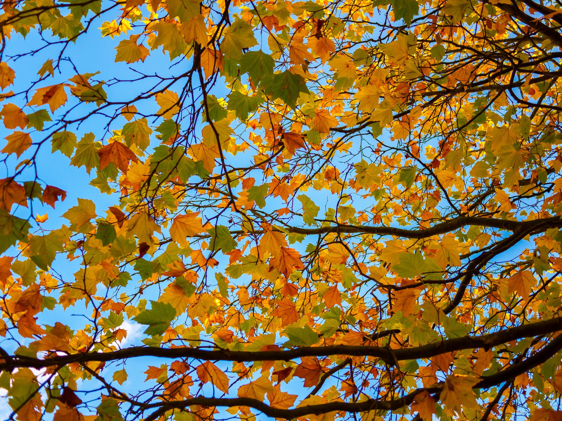 Foglie d'autunno su uno sfondo di cielo blu