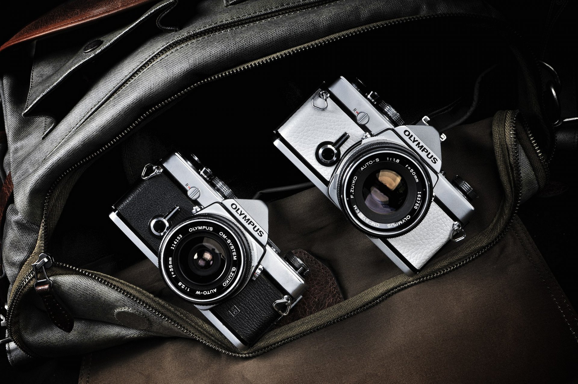 Due macchine fotografiche rosa e rosso con lacci su sfondo grigio