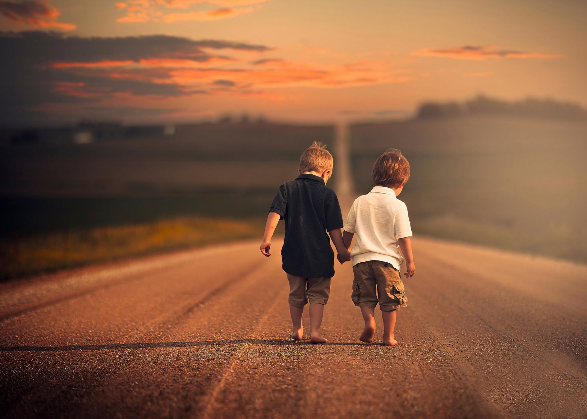 Due ragazzini a piedi nudi che camminano su una strada vuota