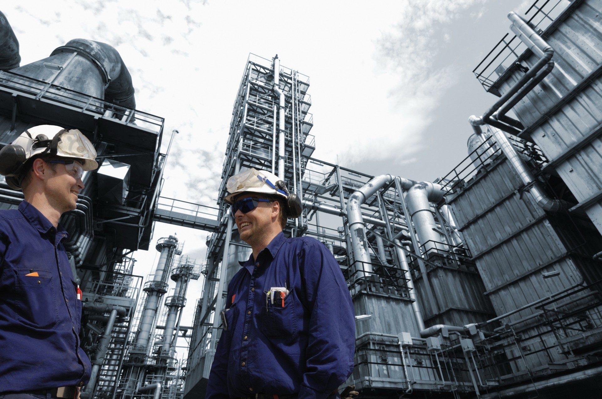 Ingegneri al lavoro. Uomini in uniforme sullo sfondo di un edificio industriale
