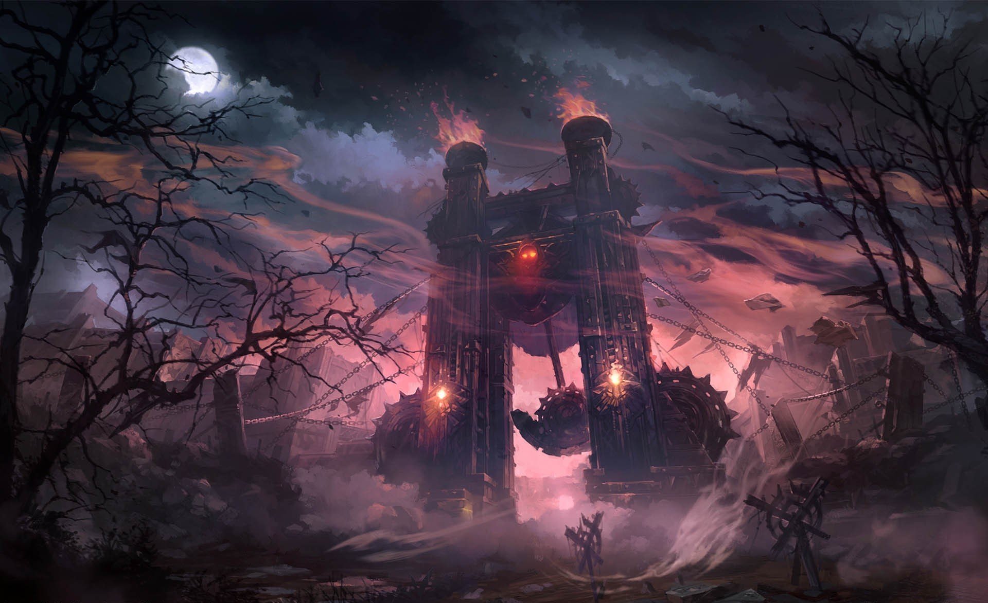 Luna nel cielo scuro della sera. Arco con colonne tra rami spogli nell'oscurità notturna