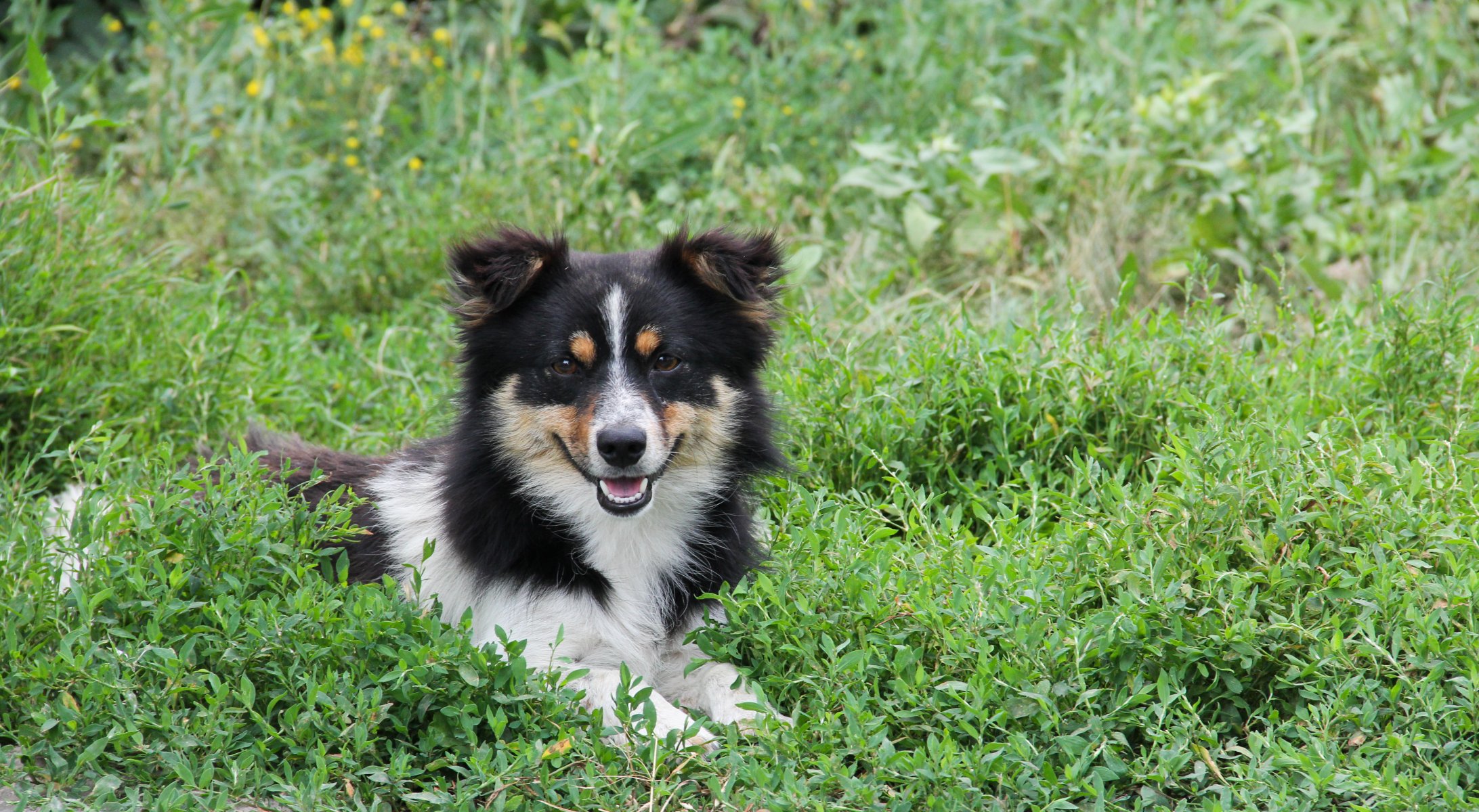Grande cane gentile sdraiato sull'erba con sfondo sfocato