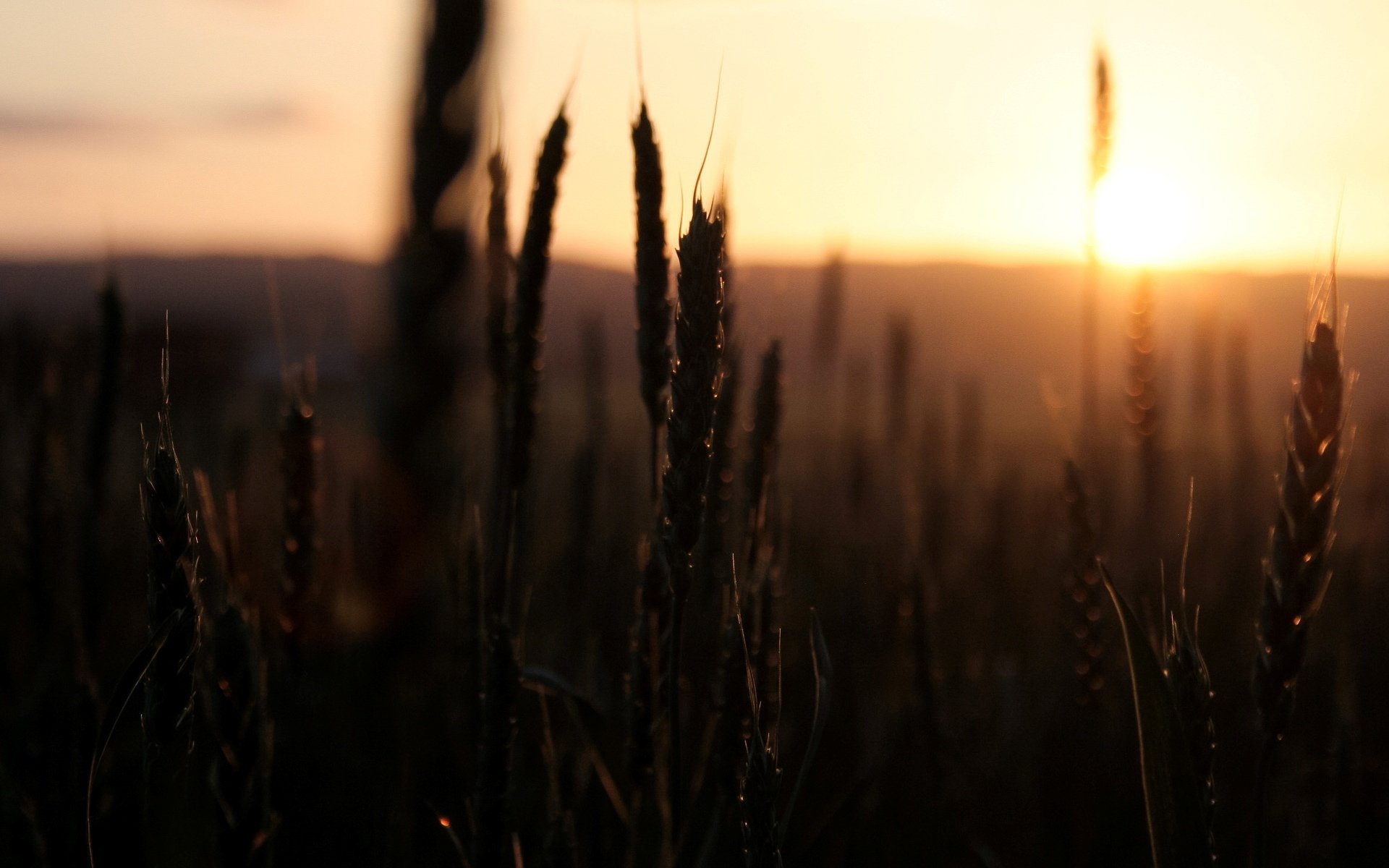Macro spighe di grano Mature sul sole al tramonto e sfondo rosa del cielo