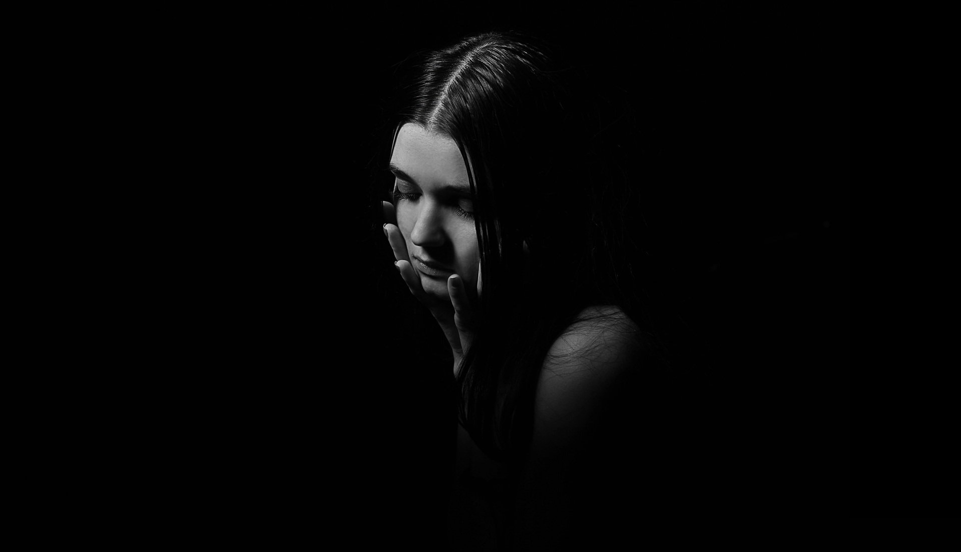 Faccia di una ragazza con i capelli blu in occhiali su uno sfondo di astrazione