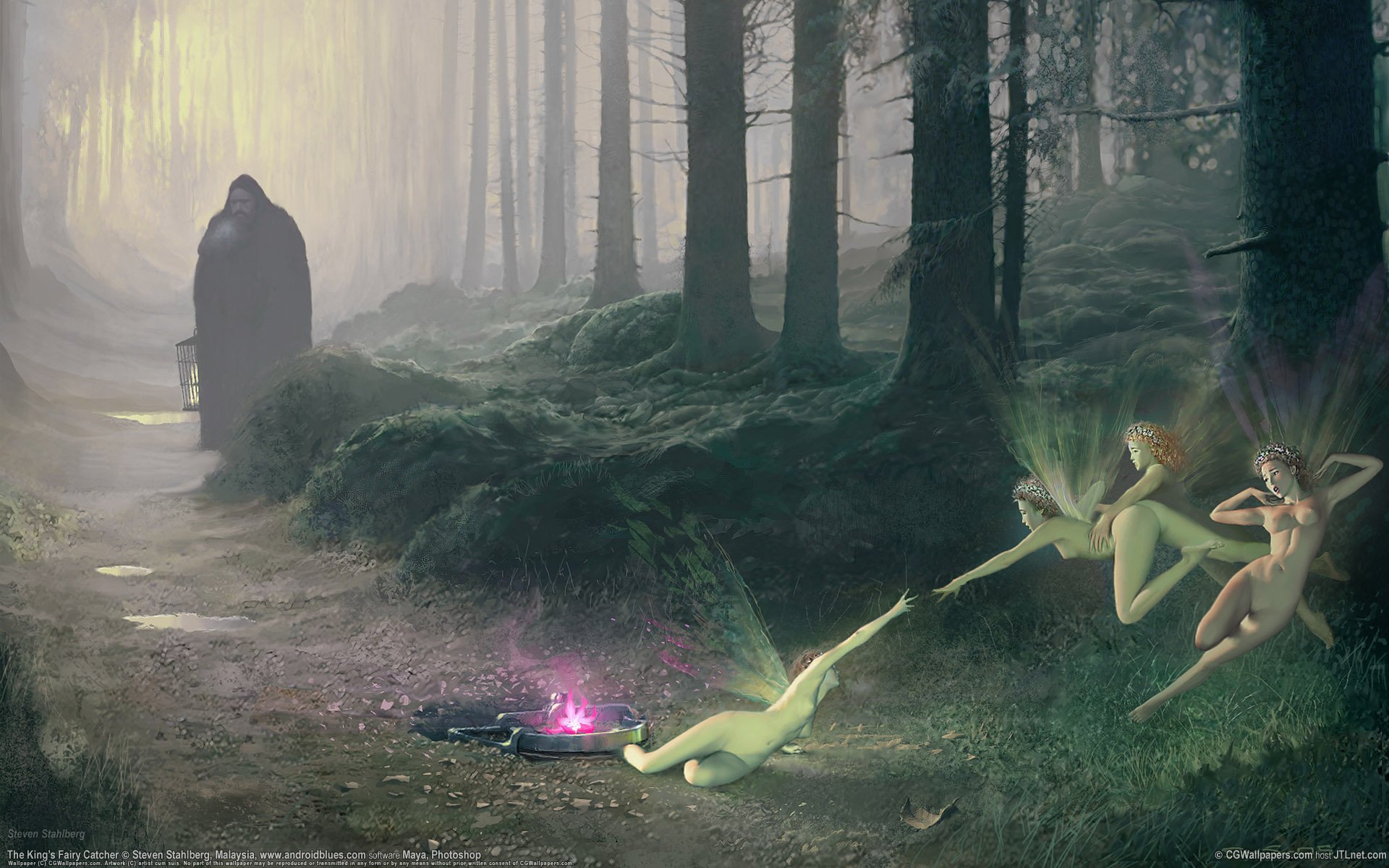 Foto in stile fantasy. Le fate sono intrappolate, il cacciatore guarda dal lato