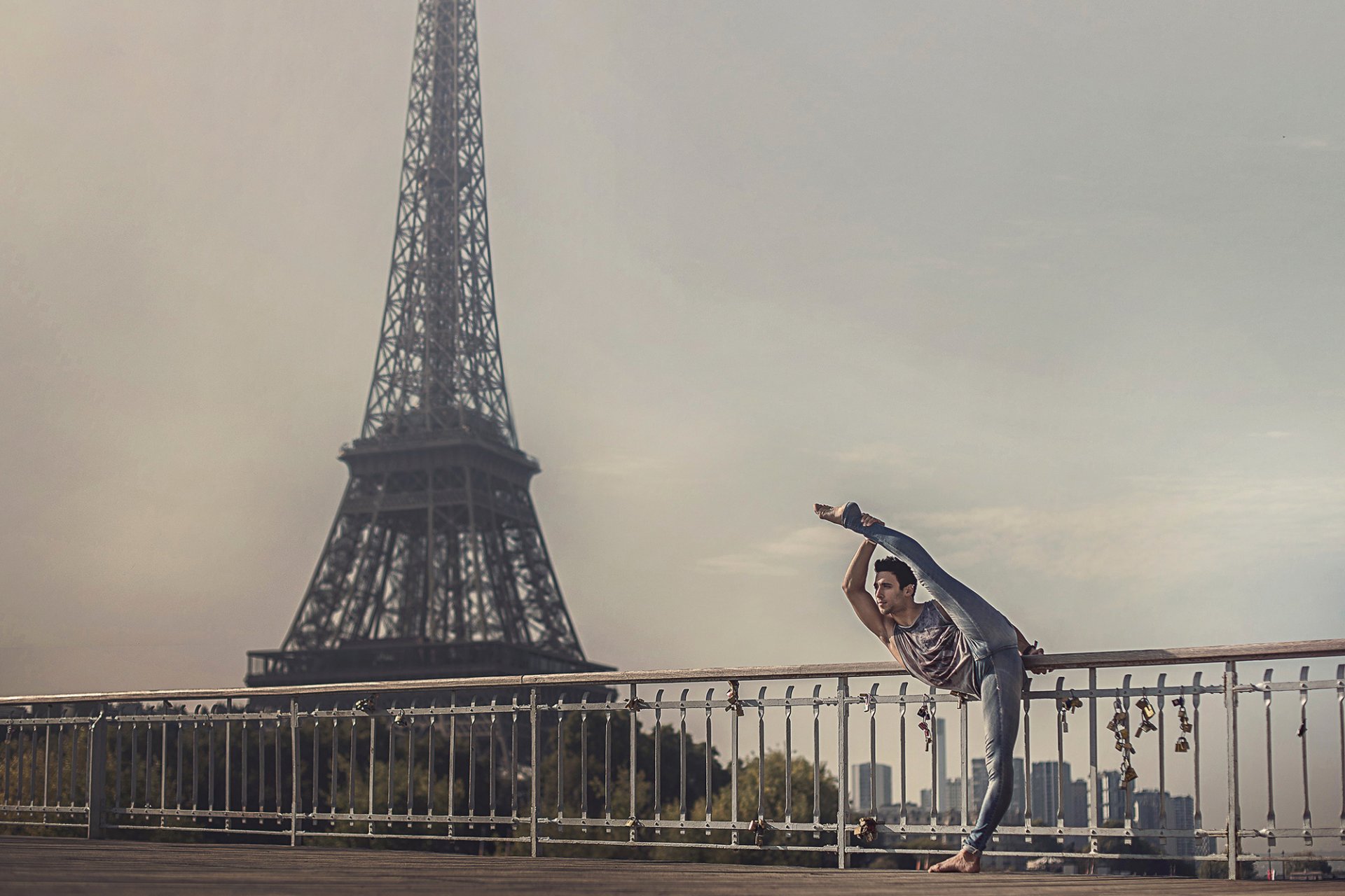 Ballerina che fa stretching sullo sfondo della Torre Eiffel