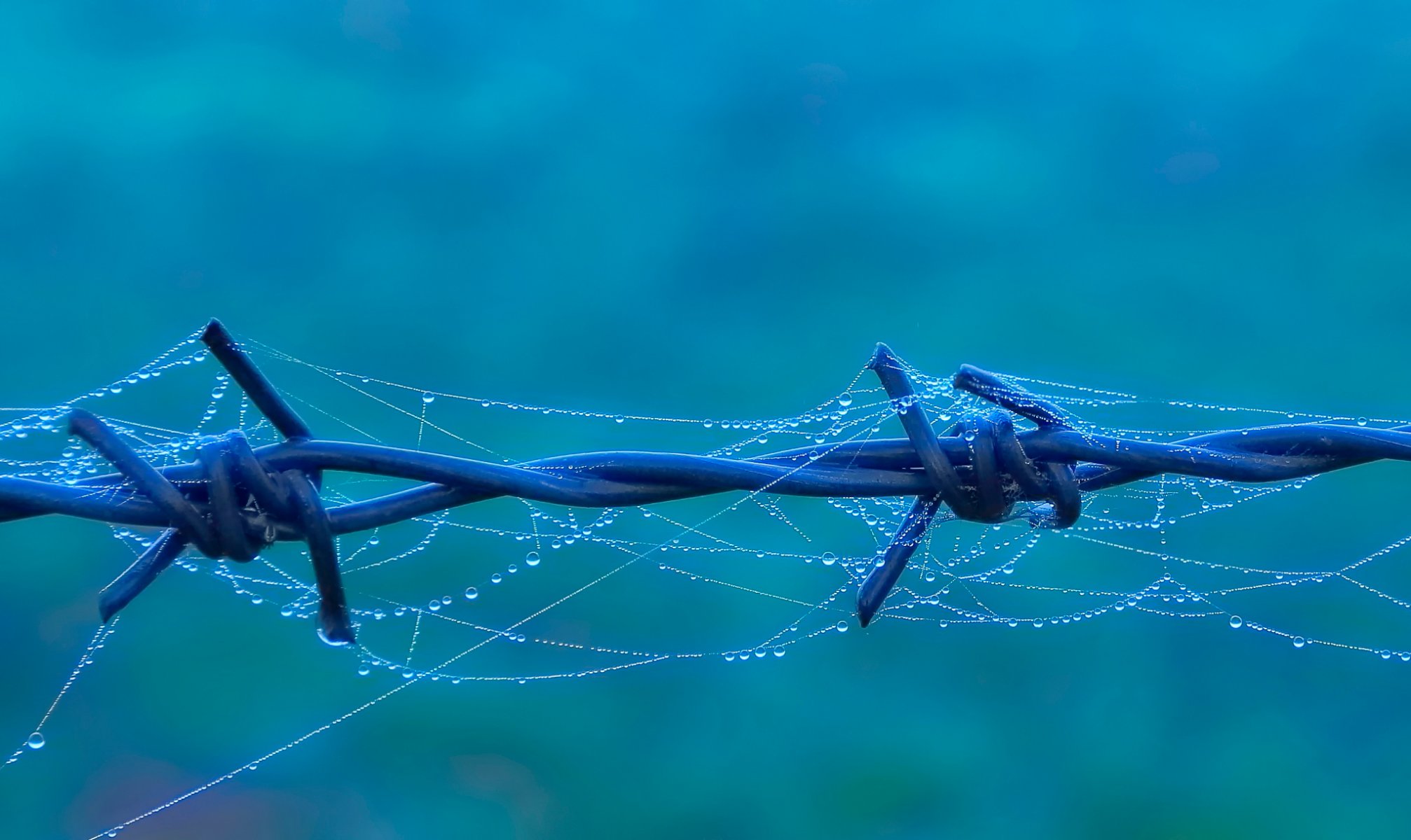 Sul filo spinato Ragnatela con gocce d'acqua