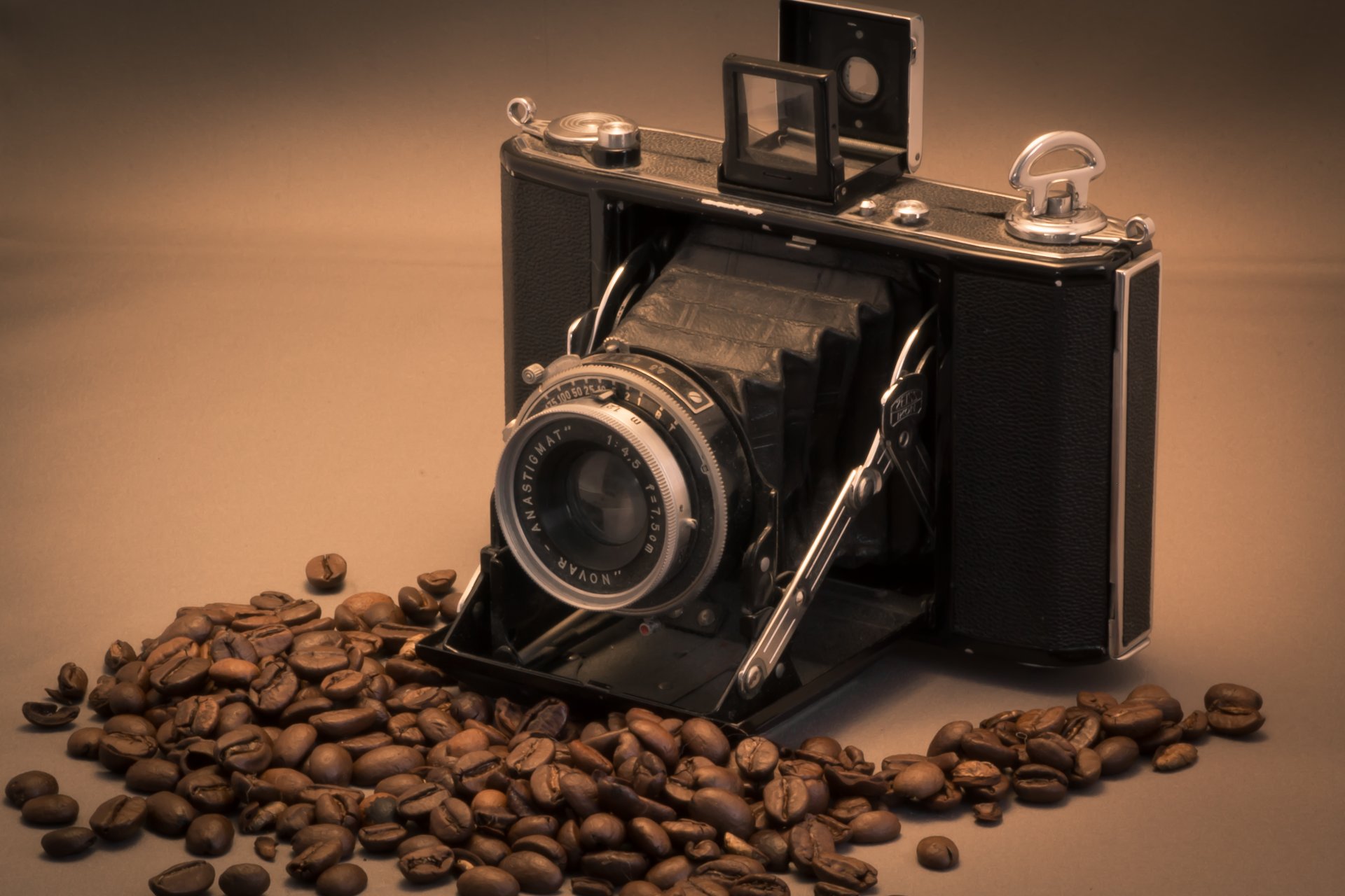 La macchina fotografica si trova sul tavolo con chicchi di caffè