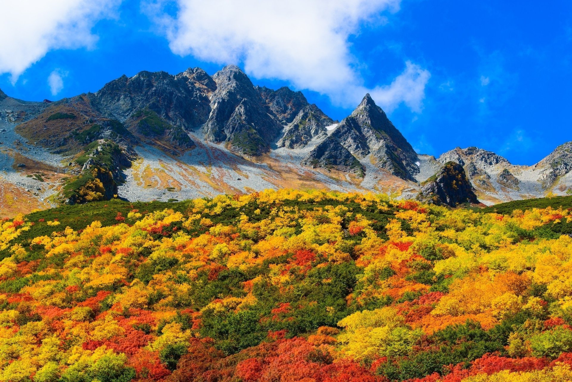 Autunno dorato in montagna su uno sfondo di cielo blu