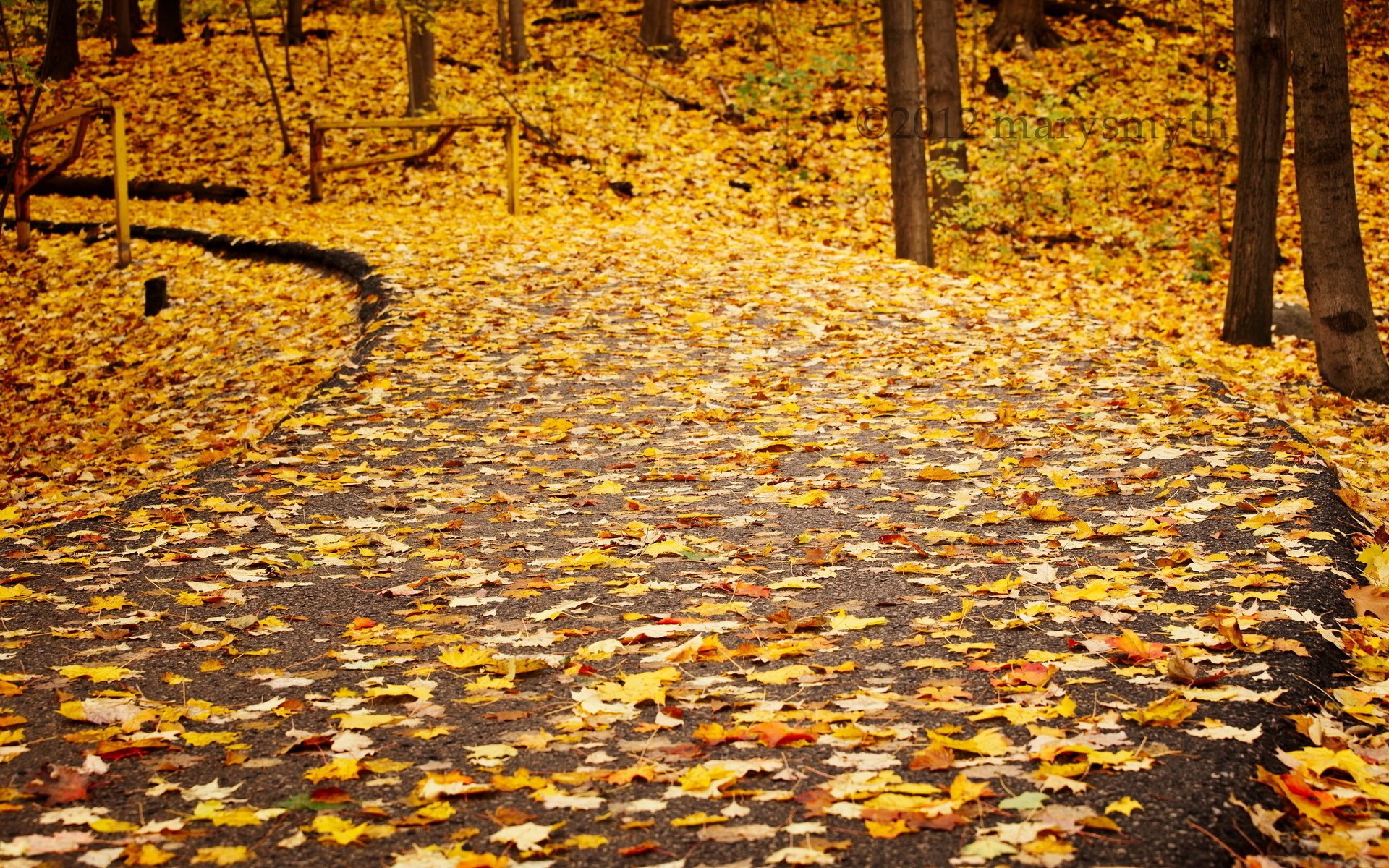 Strada in autunno cosparsa di foglie cadute ingiallite