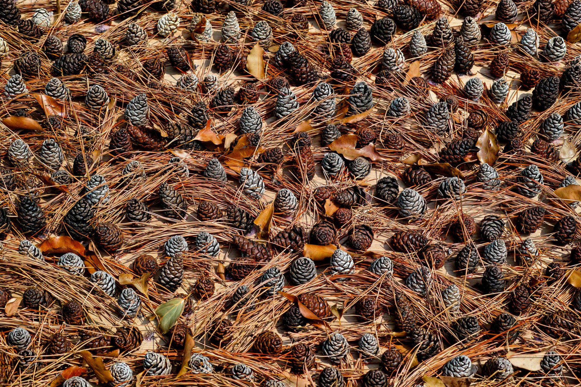 Terreno in una foresta di conifere con coni e aghi di pino
