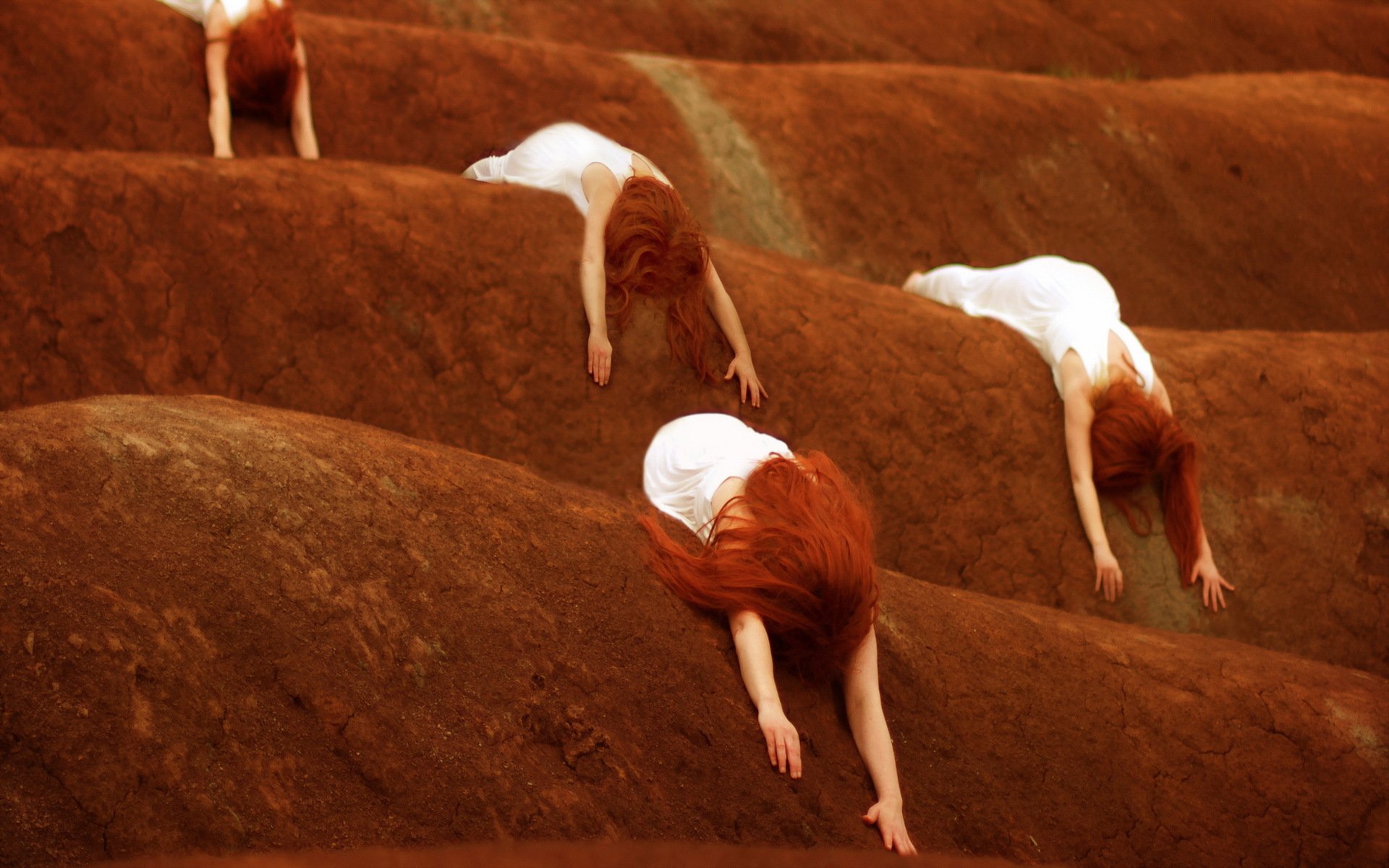 Donne dai Capelli rossi in bianco abbracciato la terra