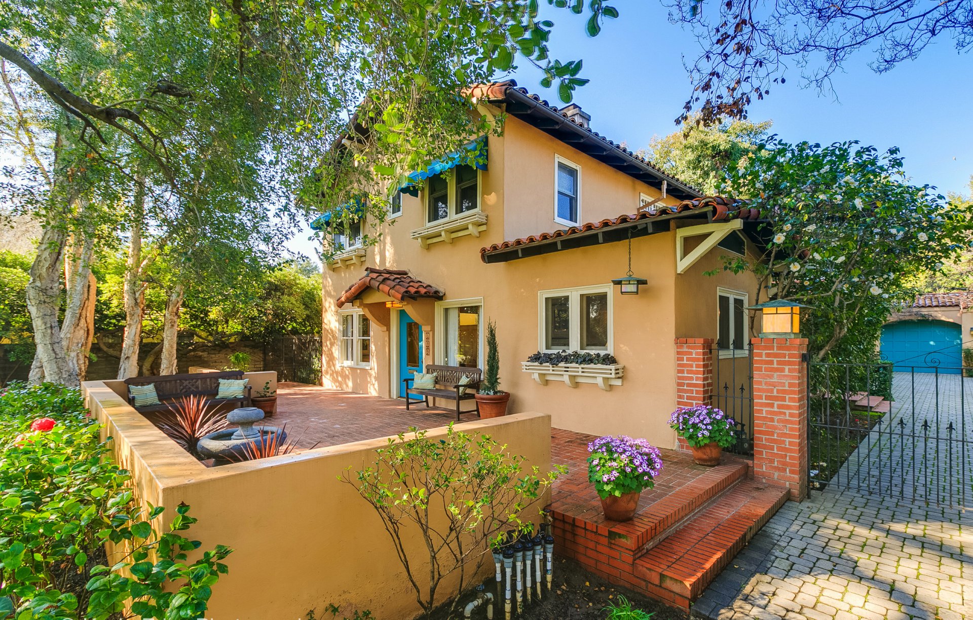Foto a colori di un cane con orecchie lunghe in un giardino fiorito