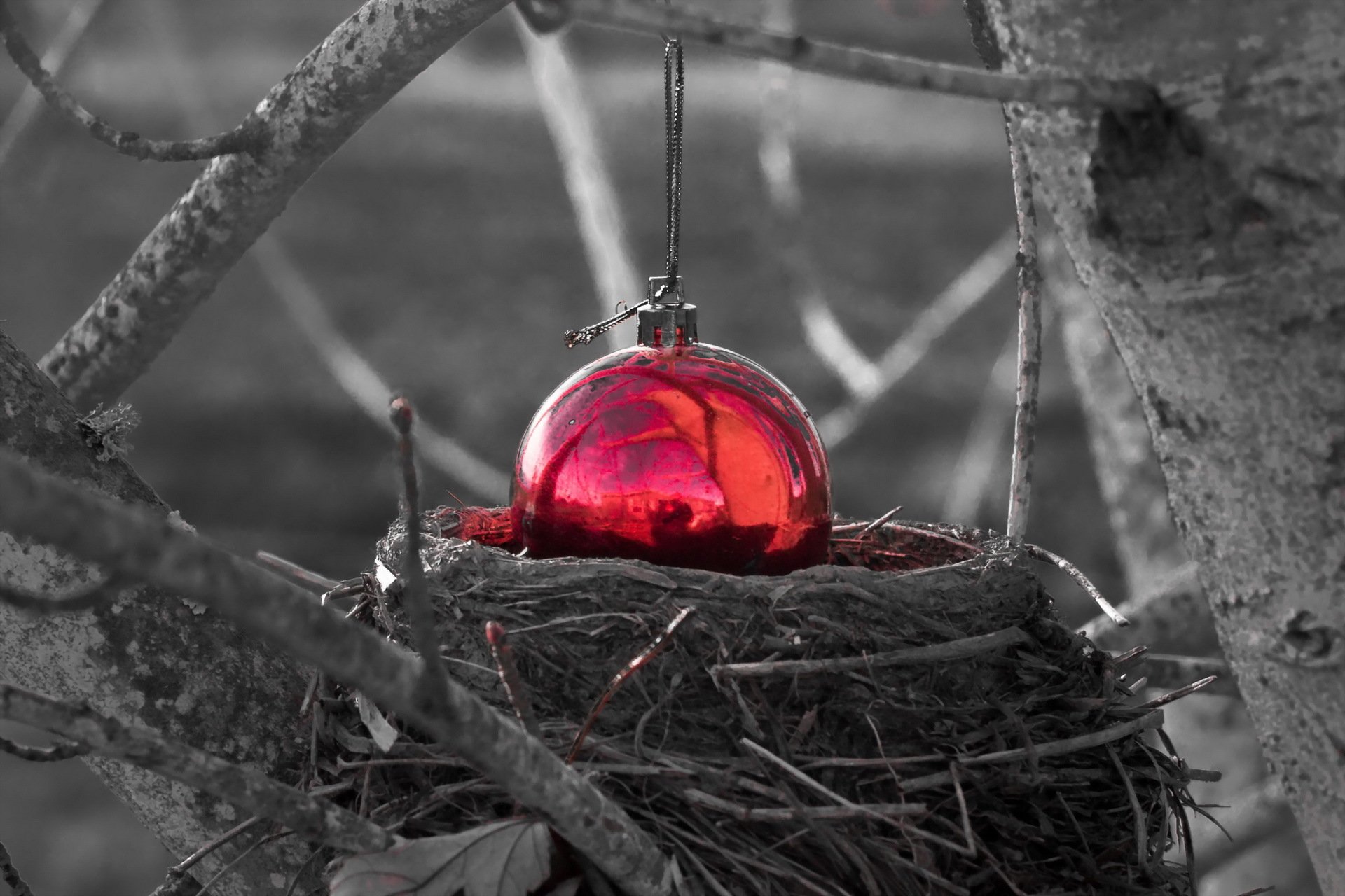 Foto di Natale di un ramo di sorbo con un giocattolo di Natale