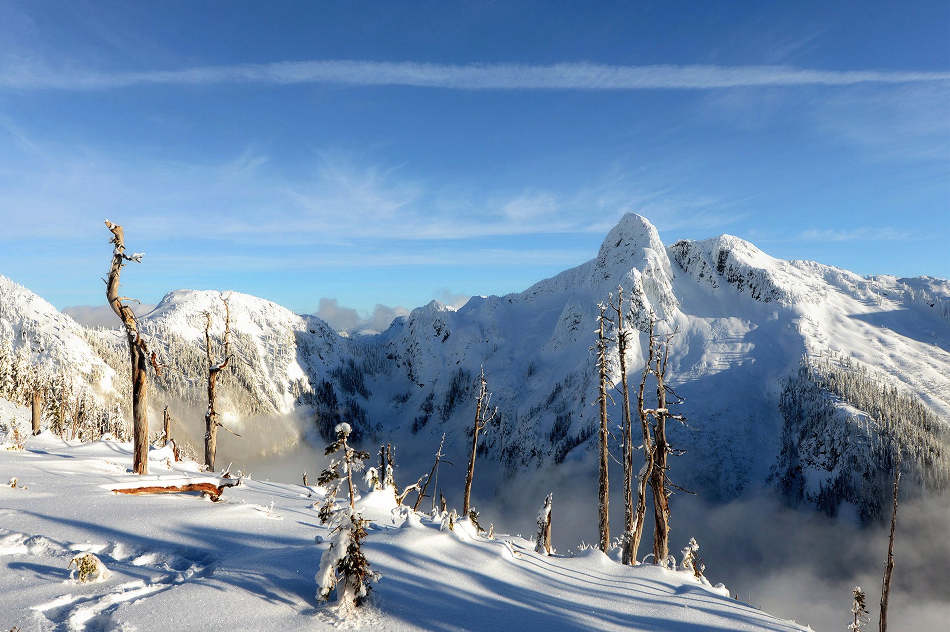 Riflesso della cima di montagna nell'acqua della riva della foresta