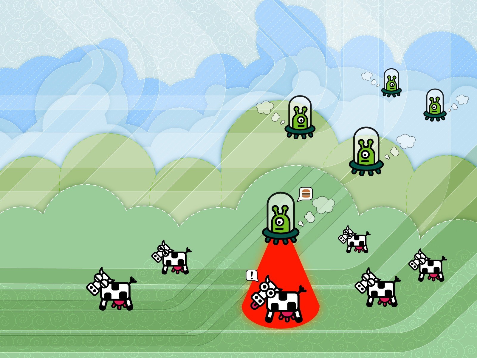 Disegno di mucche al pascolo che vengono rapite dagli alieni