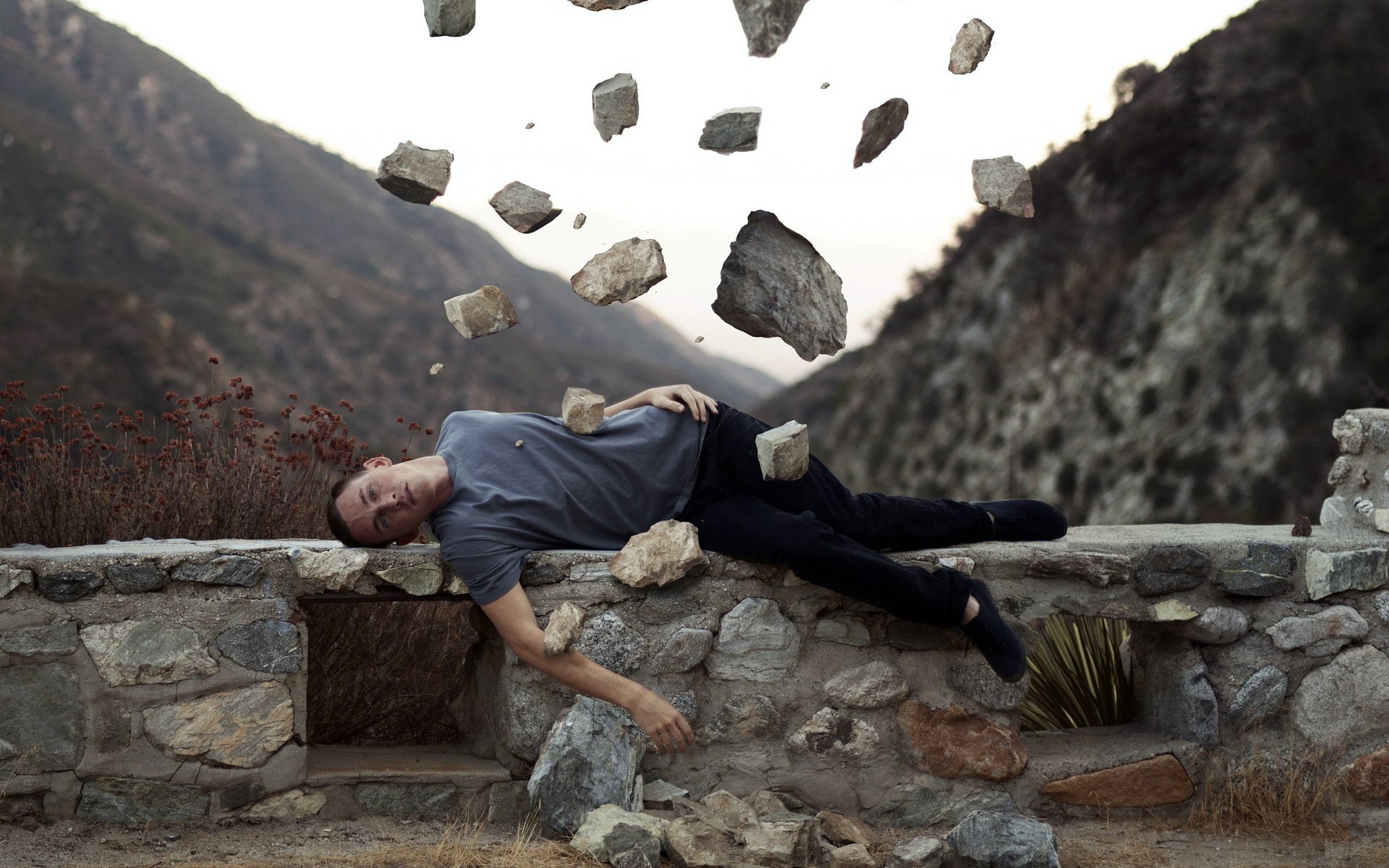 Ragazza in abito bianco seduta sulle pietre con una mela in mano