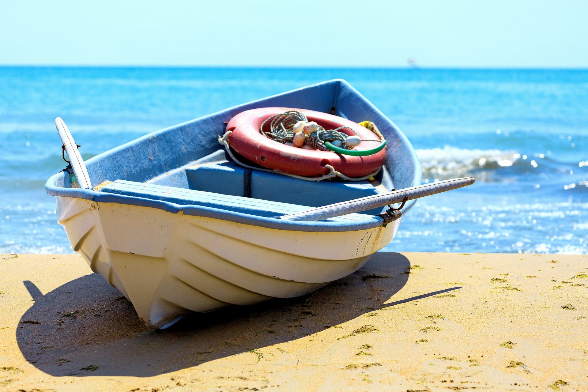 Nave a terra. Spiaggia pulita. Cucchiaio blu