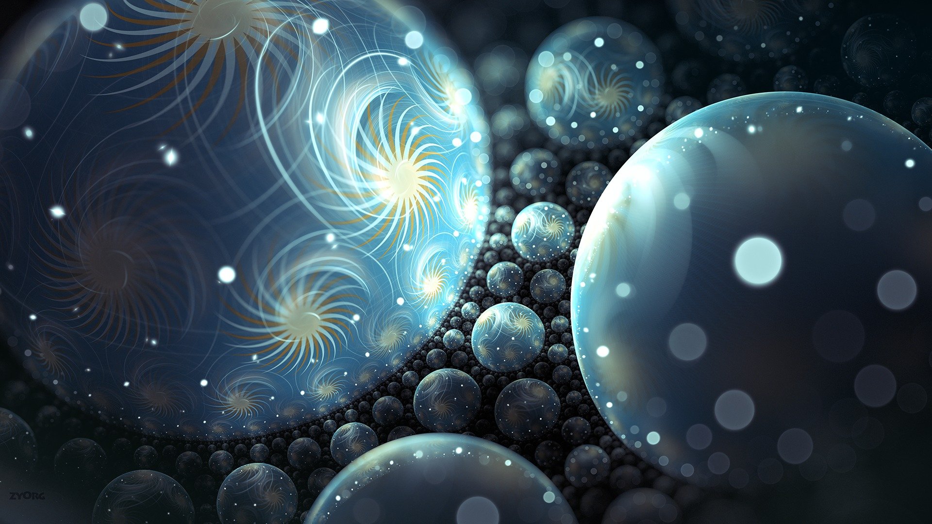 Motivo vegetale di una foglia e fiori con una palla magica al centro su uno sfondo nero e blu