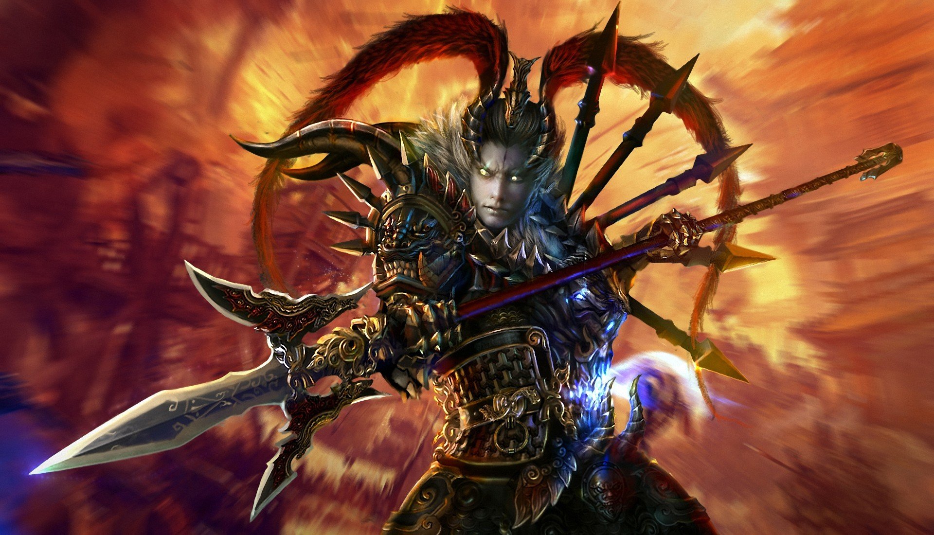 Guerriero in bella armatura in possesso di un fulmine su sfondo nero
