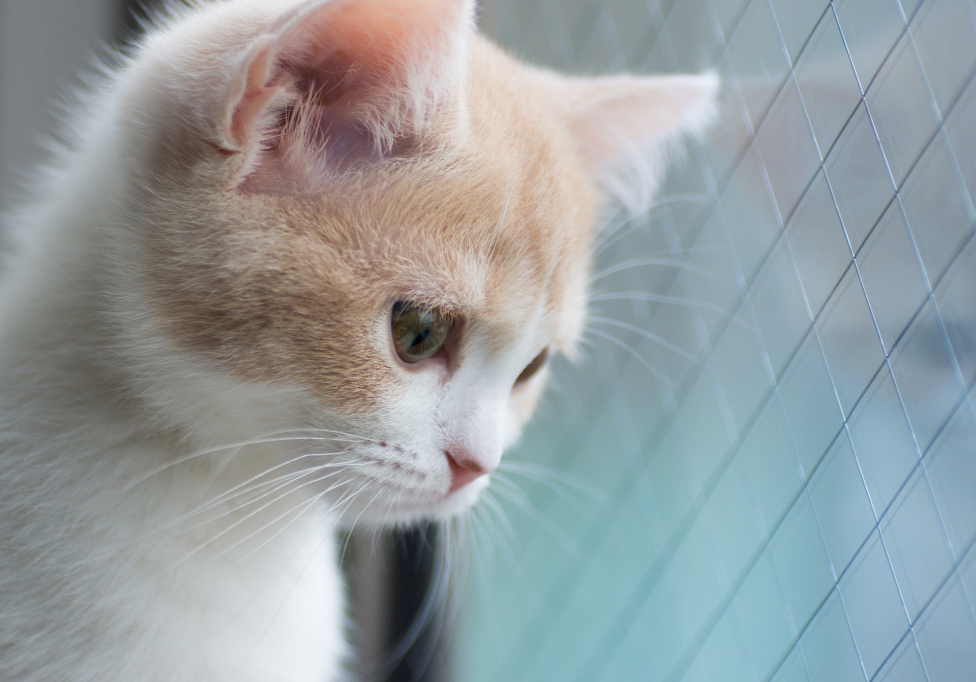 Gatto bianco e rosso sdraiato su un tappeto bianco