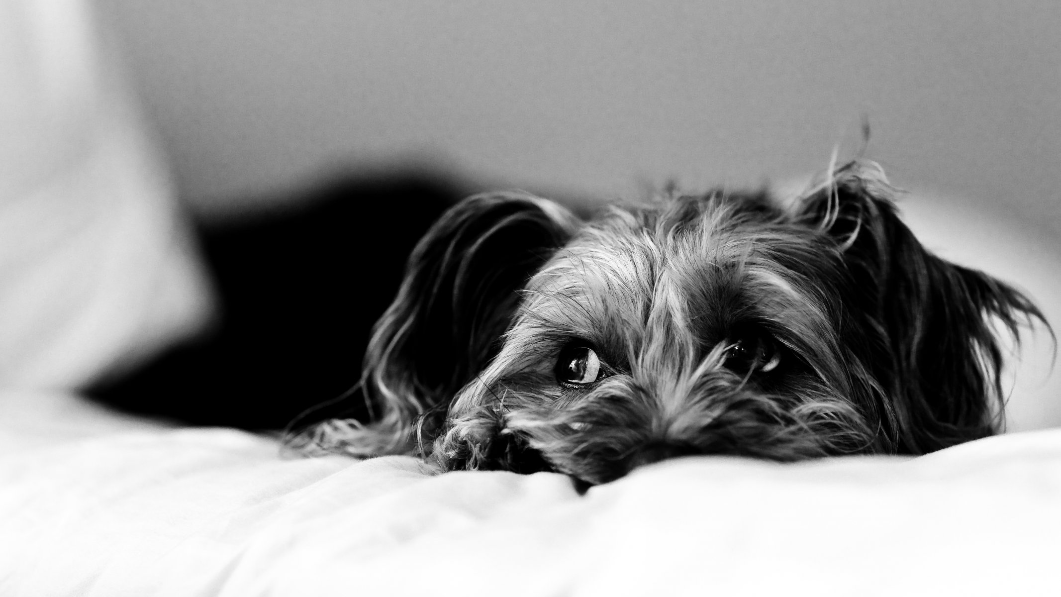 Foto in bianco e nero con un cane sdraiato su un lenzuolo