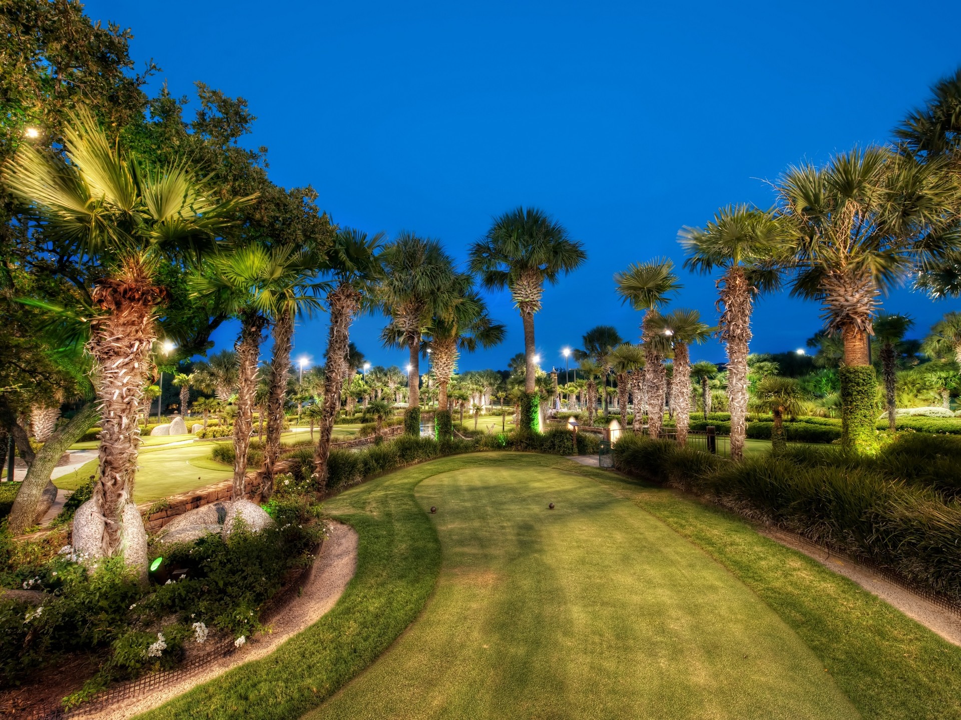 Cortile di una casa di campagna o di un hotel con piscina e lettini la sera