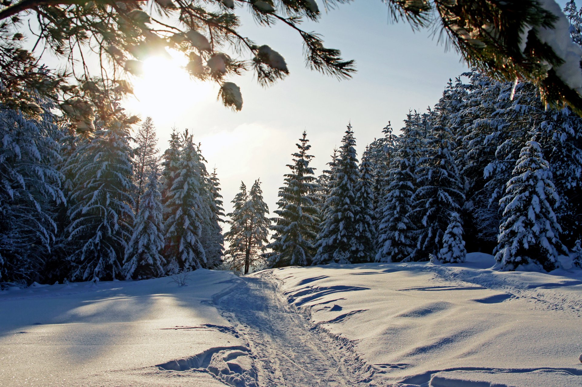 Villaggio invernale avvolto nella neve contro il sole splendente