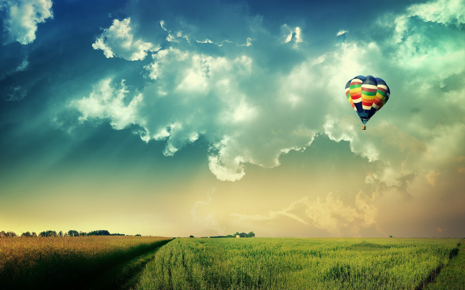 Viaggiatori in mongolfiera sopra i campi